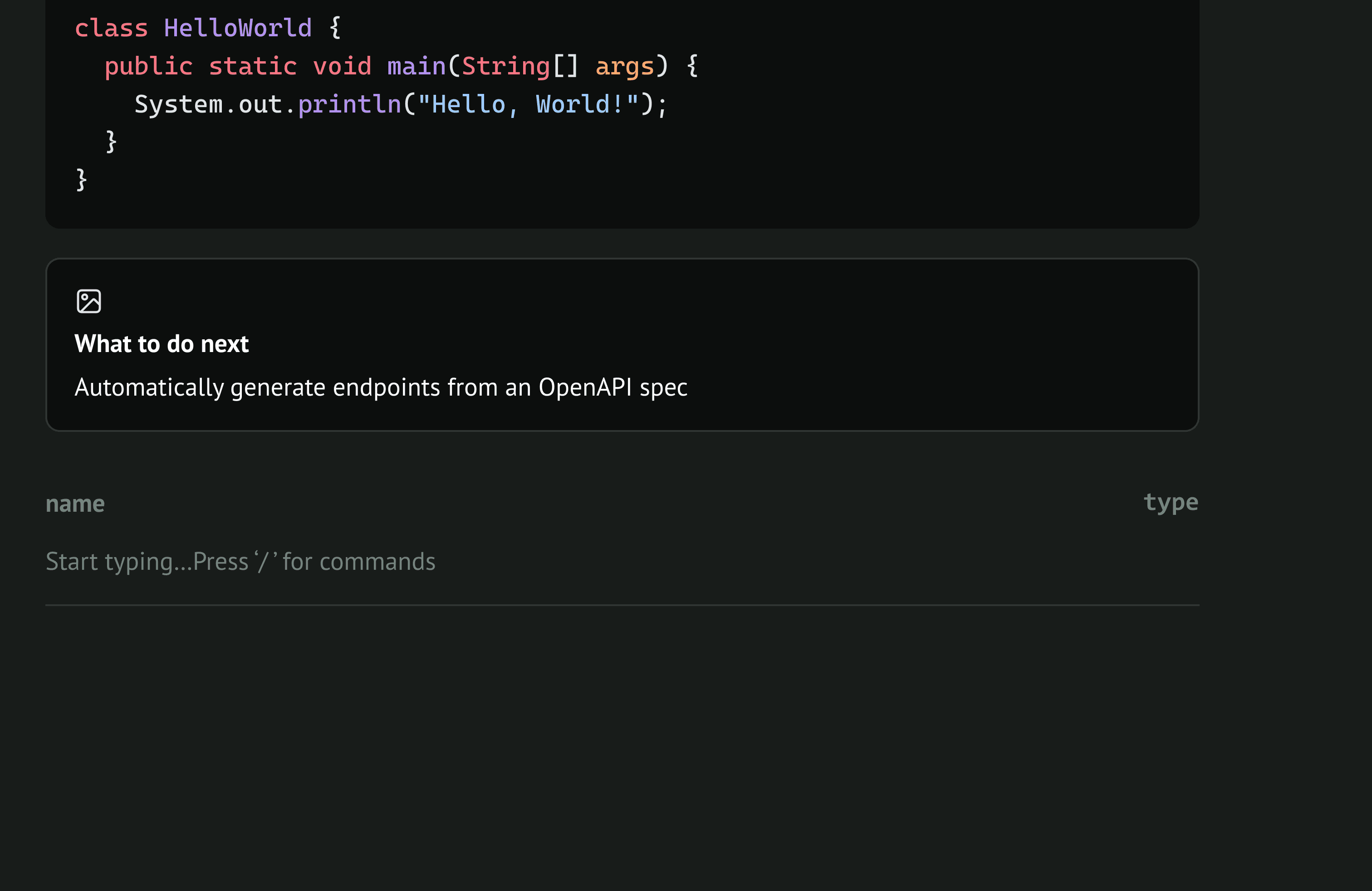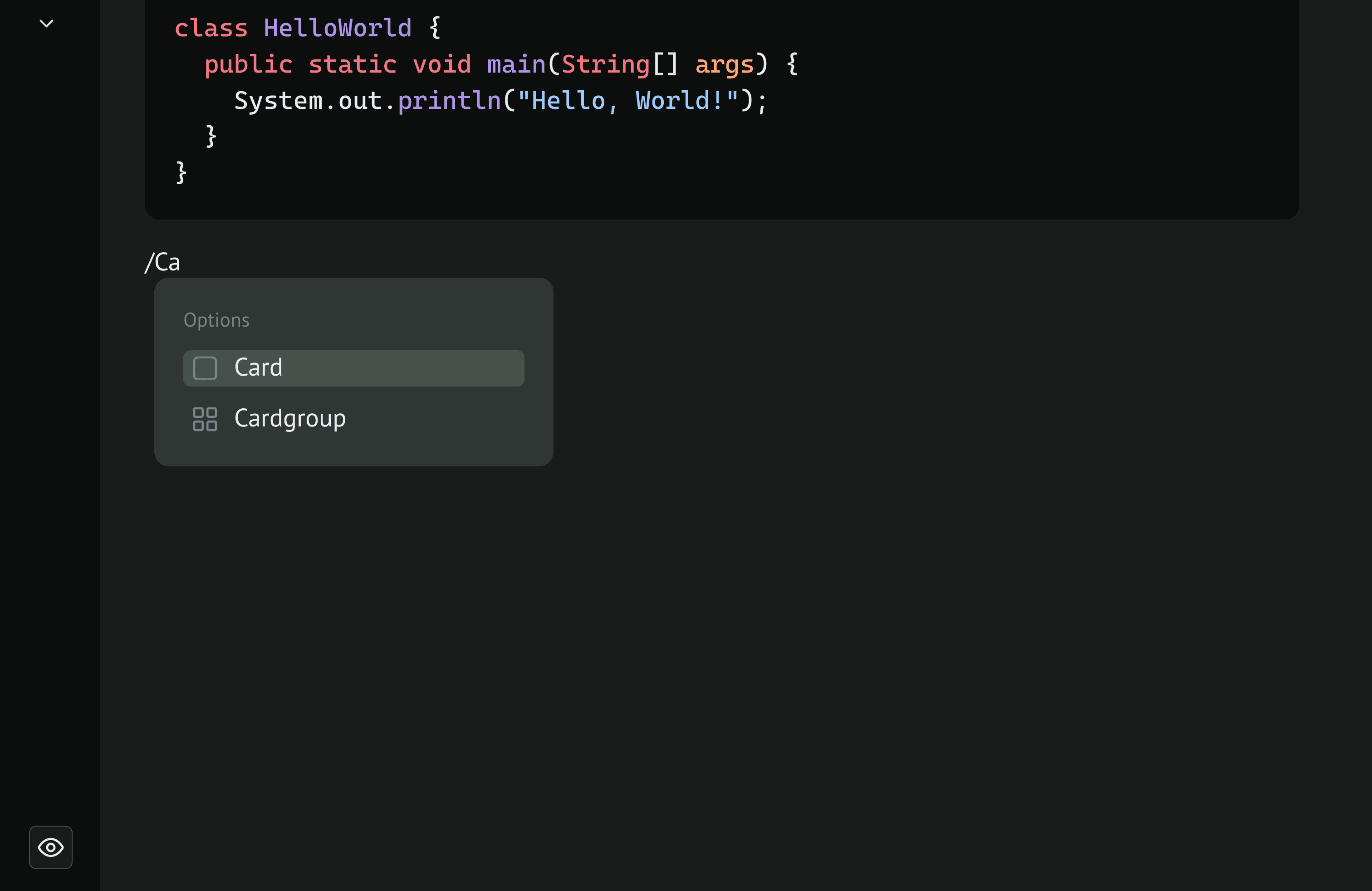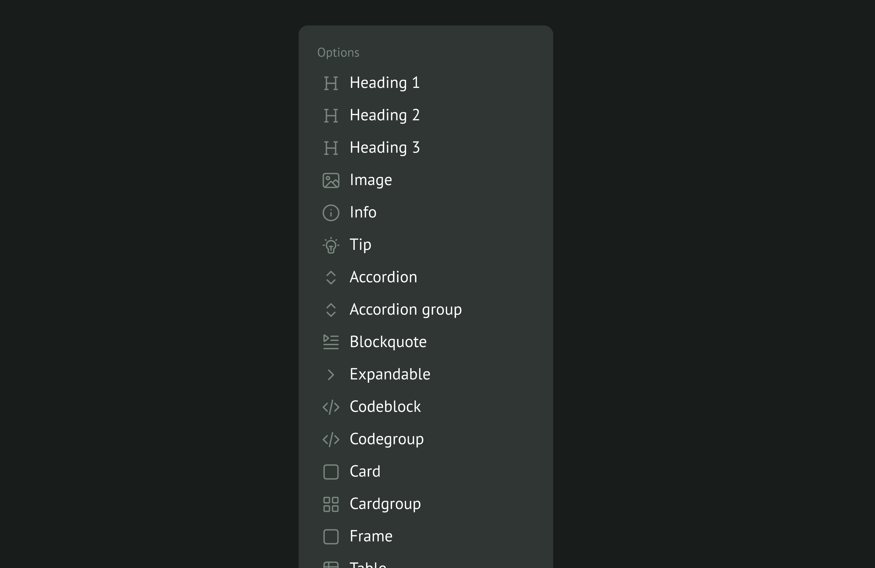 Here’s what I mean. Lily is given a canvas where she can add content called blocks. Blocks could be Text, Headings, Info, Tip, Accordions etc. To access these blocks, she uses the ‘ / ’ command. This opens a menu for her to choose what blocks to add.