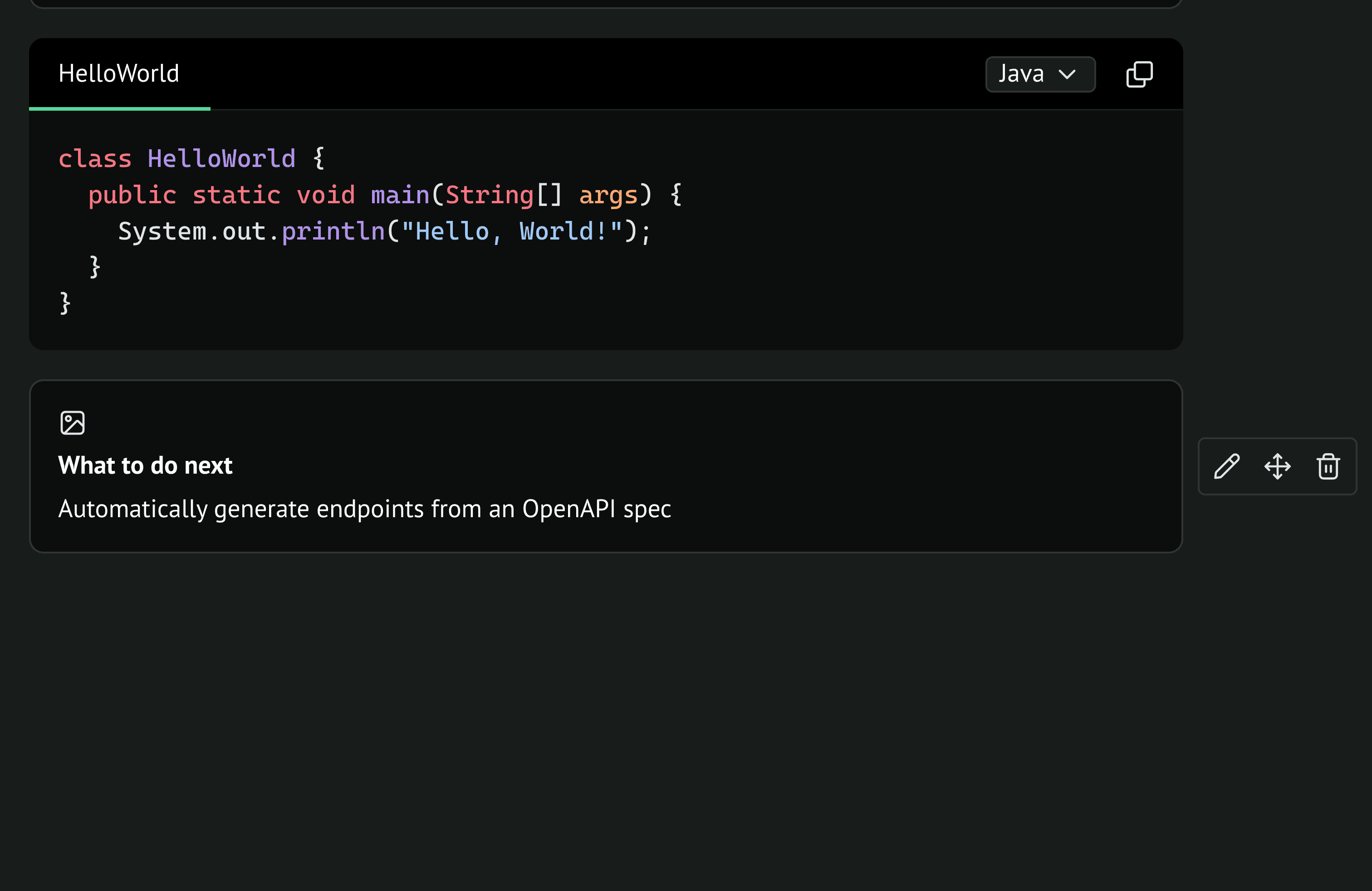 Lily can also add a card from the command menu. Hovering on the card [and other blocks] gives you 3 options. Edit the content, move, or delete the block. Lily can edit the card to change the Icon and URL.